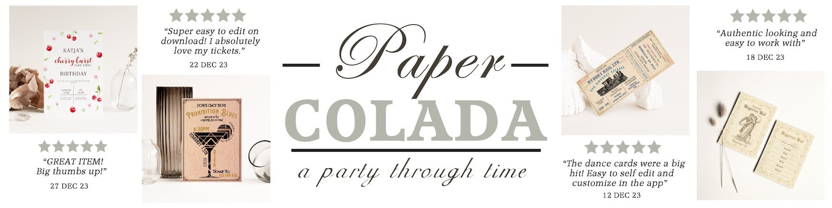 Welcome to Paper Colada, a Specialty Shop for Vintage and Retro Editable Invitations selling on Etsy for over 10 years.
