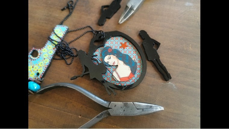C’est ainsi qu’après avoir longuement économisé, j’ai pu m’offrir ma “baguette magique”, une machine imposante, lourde et fragile qu’il a fallu caler au fond de mon garage, ma machine à découpe laser...Je découvre ses possibilités tous les jours et je créais avec passion ces minuscules ou imposants bijoux colorés, incongrus et rigolos.
