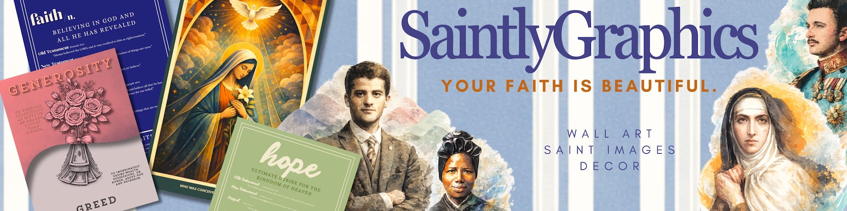 SaintlyGraphics is born out of the belief that beauty will save the world. Our mission is to create the most beautiful products which help you express the truth and goodness of the Catholic Faith. Please share how we can offer more beauty to you!