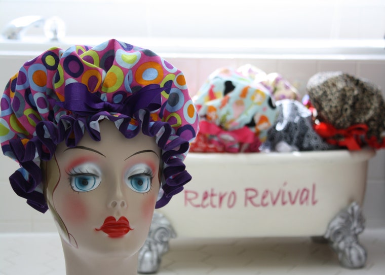 Oh! And I make women’s waterproof, washable shower caps! Why you may ask? Because this curly, frizzy haired gal goes to a lot of work transforming her hair into a presentable ‘do and the shower steam destroys my coif! I couldn’t find a decent looking cap that actually worked so I made one, then dozens more and gifted them to more friends and family before I had perfected the design. Fast forward four years and I’ve sold thousands of them, yes, thousands! Curly haired ladies unite!