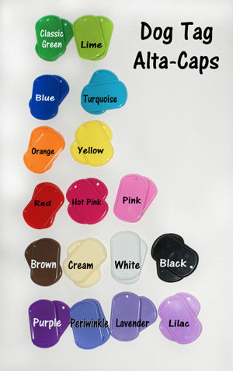 Newest product Alta-Cap Dog Tags available in 17 colors. Thick, sturdy plastic do not chip like painted metal.