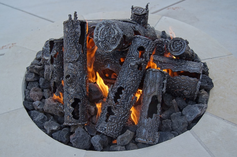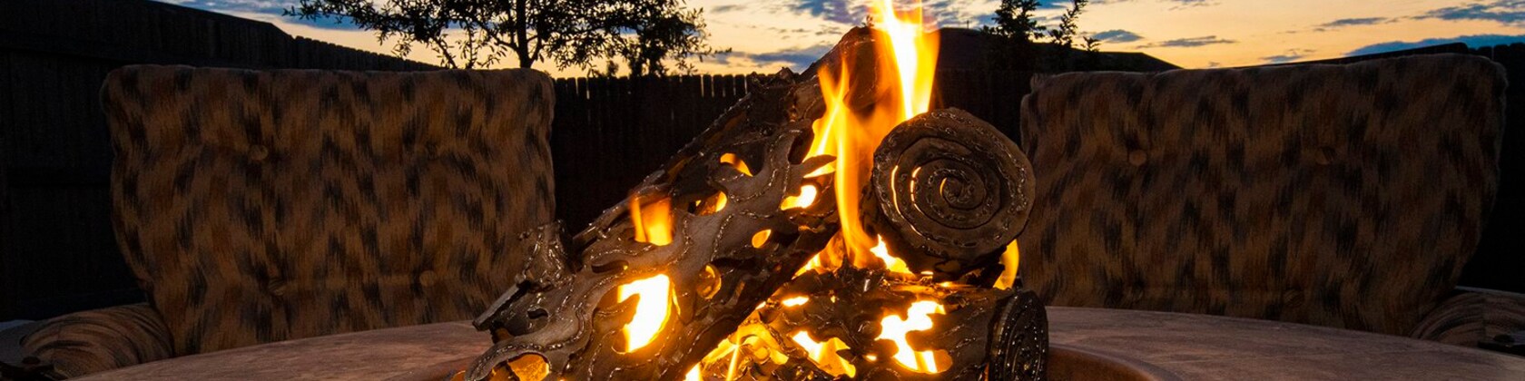A SW Colorado based artist welds steel pipe into wood-log sculptures for your gas line fireplace, creating Art on Fire!