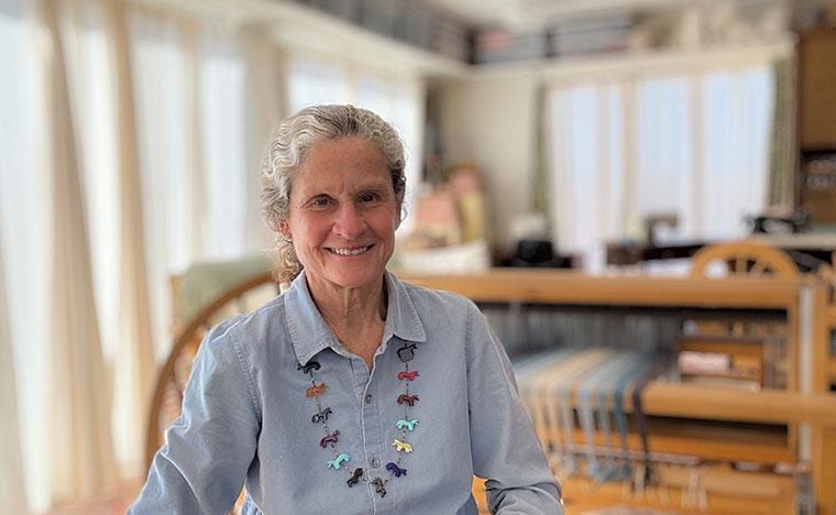 Ik herinner me een verhaal dat ik ooit las over een jong Navajo-meisje dat urenlang verrukt een tapijt aan het weven was. Ze beschreef haar gedachten als overal... en nergens. Dat is precies hoe weven voor mij voelt. Of het nu op een groot vloerweefgetouw is of op een eenvoudig schootweefgetouw, het kloppende ritme is meditatief en kalmerend. Je kunt niet anders dan vertragen en ontspannen.