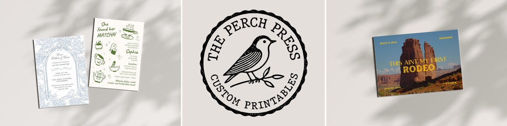Nestled at the intersection of creativity and convenience, The Perch Press was founded on the belief that beautifully designed moments should be accessible to everyone. Like a bird carefully selecting the perfect branch to perch upon, we curate thoughtful, stylish, and easy-to-use digital templates that help bring your celebrations to life—effortlessly.