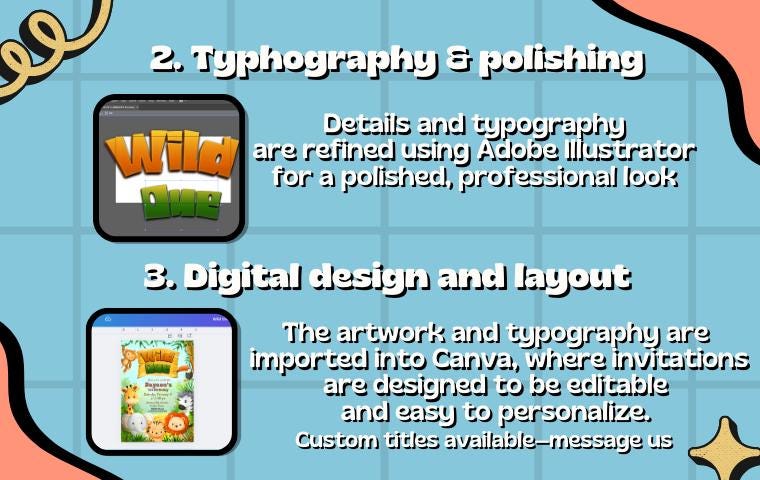 Titles are professionally designed, then prepared in Canva for easy editing or custom orders.