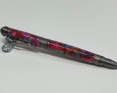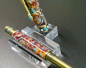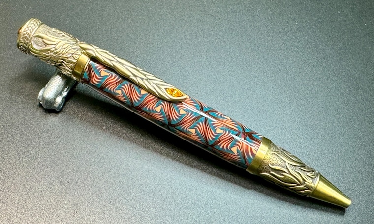 What’s a polyclay pen, you ask? Well, I start with a pen kit (hardware for pen) and carefully craft polymer clay canes in a variety of colors, shapes & patterns. Next, I cover the brass tube from the pen kit with slices of the cane & oven-cure. What results is a polyclay pen blank, ready for the lathe for sanding to the kit’s bushings design specs. Once off the lathe, I carefully inspect the blank to ensure it’s defect free. From there, I move back to the lathe for surface finishing. This entails putting the polyclay blank through a series of fine, micro mesh polishing pads to smooth & eliminate surface scratches. Once I’m satisfied, I begin the cyanoacrylate (CA) finishing process starting with 5 or more coats of thin CA followed by 3 or more coats of medium CA. This process seals the blank and starts the final lathe process of micro mesh polishing, creating a glass like shine. Then I take the finished polyclay blank for final assembly process. I assemble the remain pen kit hardware to the polyclay blank, inspect for imperfections. The end result: a unique, one-of-a-kind beautiful, handcrafted polymer clay pen for you.