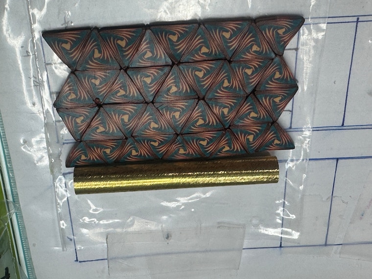Las arcillas translúcidas crean una ilusión de profundidad, ¡haciendo que los diseños parezcan flotar! ¿Cómo? Empiezo con un pequeño tronco de arcilla translúcida, luego lo envuelvo con capas de arcilla blanca y negra, luego agrego otra capa de translúcida... repito las capas hasta que estoy satisfecha con el tronco básico. Combino múltiples piezas de variaciones de tronco para hacer el diseño del bastón. Luego, reduzco el grosor del bastón apretándolo/enrollándolo hasta que alcanzo el grosor deseado. Dejo que el bastón descanse en el refrigerador hasta que se enfríe, luego corto rodajas que aplico al tubo de latón del bolígrafo. Lo horneo durante 30 minutos para endurecer la arcilla. Ahora tengo un bolígrafo de arcilla polimérica en blanco listo para convertirlo en un bolígrafo.