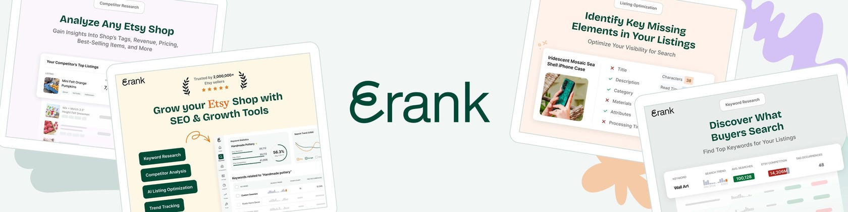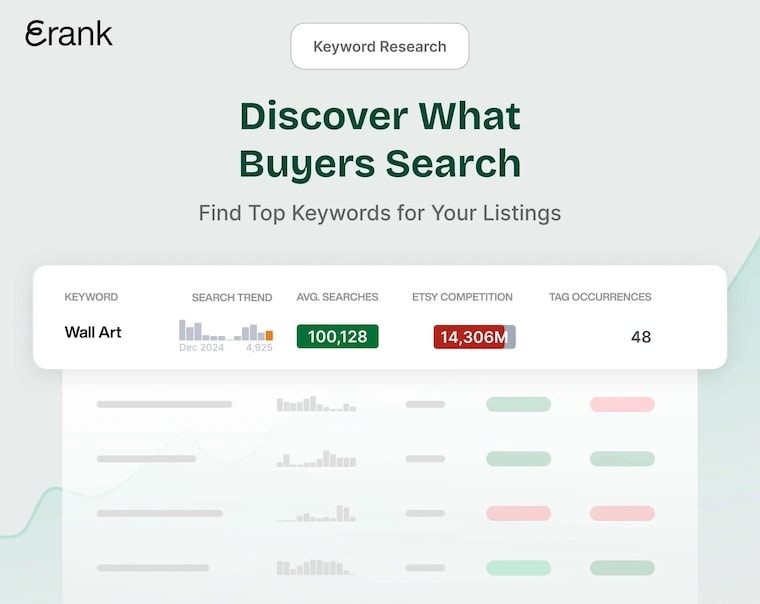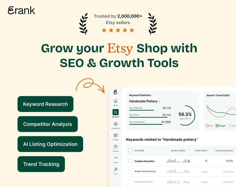 Power up your Etsy shop with data-driven insights from the top SEO and trend research tool trusted by over 2 million sellers. eRank helps you discover high-ranking keywords, track trends, and optimize your listings with real-time analytics—all in one place.