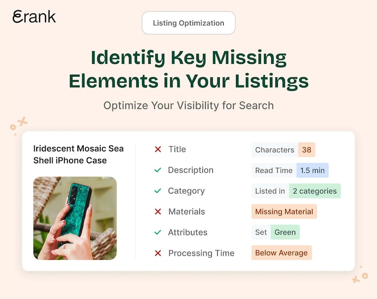 • Listing Optimization – Identify key missing elements in your titles, tags, and descriptions to improve your search ranking.