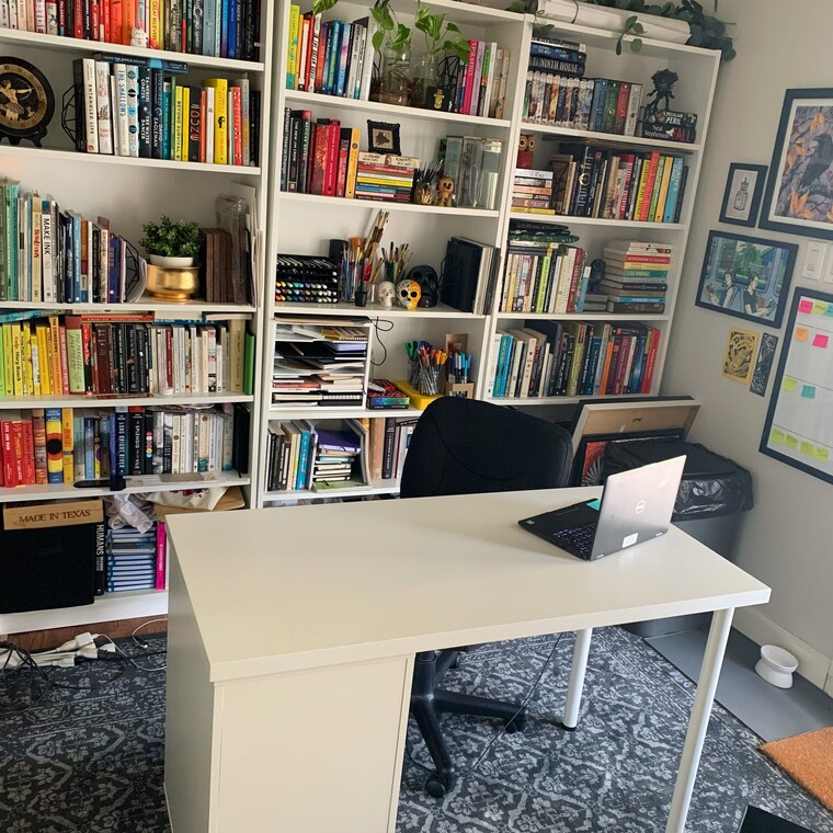 Welcome to my office! My poor books keep getting shifted around as I use up nearby shelf real estate for art supplies :P -