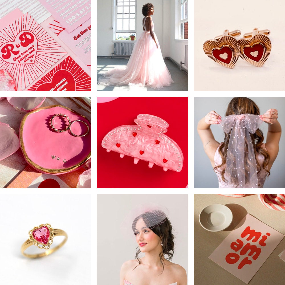 We all love a "core" trend, and lovecore is the latest aesthetic gaining traction on social media, characterized by heart patterns, roses and the colors red and pink. Now, this dreamy trend is making its mark on the world of weddings as a sweet style for hopeless romantics. When it comes to lovecore-inspired decor, there has been a 21% increase in searches for heart-themed invitations*, and an 18% increase in searches for pink menus*. Brides are also feeling the love when it comes to their looks: in the last three months on Etsy, there has been a 22% increase in searches for pink morganite or moissanite engagement rings*, a 19% increase in searches on Etsy for hot pink bridal items*, and a 14% increase in searches for pink or red veils.*