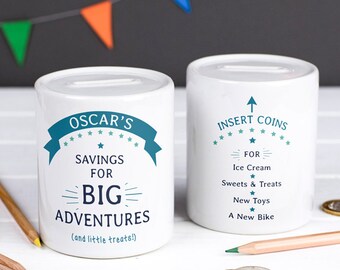 Not only can you personalise the front of the money box with their name but you can also select up to four money saving goals to add to the back of the bank.
