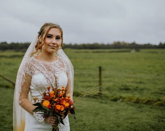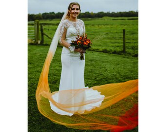 Als je op zoek bent naar iets heel anders voor je grote dag, zoek dan niet verder! Deze prachtige dieporanje ombre sluier is perfect voor een herfstbruiloft met levendige tinten.