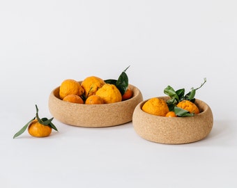 These cork bowls with all natural rope handles are hand-turned in Oakland, CA. Cork is a naturally antimicrobial and hypo-allergenic, making it an ideal material for food. Each bowl has a hand sanded interior and finished with a natural beeswax. Perfect as a fruit bowl or the ever random catch-it-all bowl. Each bowl is one-of-a-kind and vary a little in size and color.