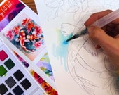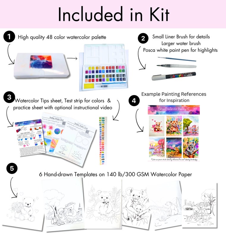 The kit includes 6 hand-drawn templates on high-quality watercolor paper, a 48-color vegan watercolor set, brushes for detailing, a Posca White Paint Pen, practice worksheets with video tutorials, test strip paper, and example paintings for reference.