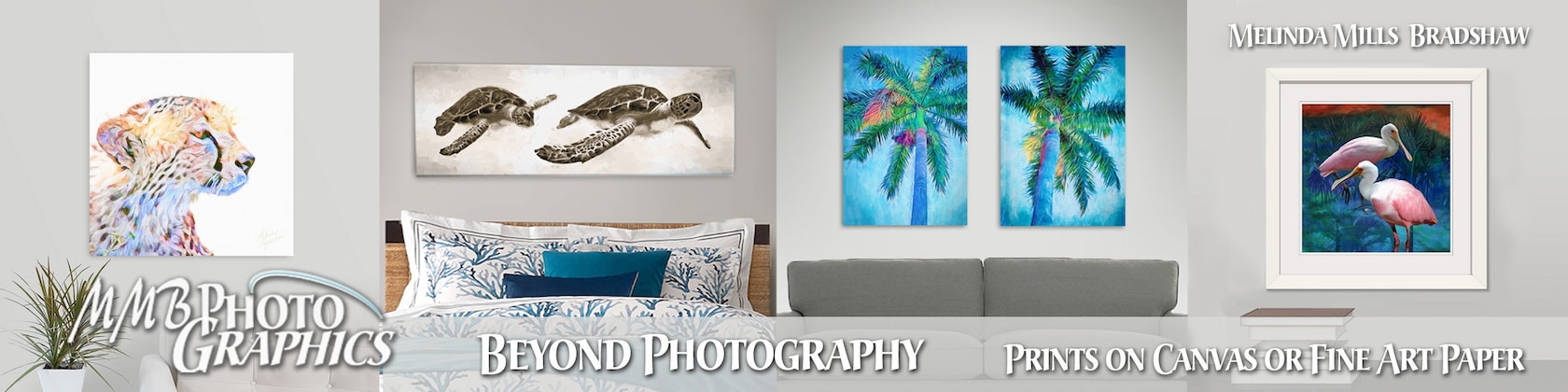 Bradshaw begins with her own ORIGINAL photographs. Working in Photoshop, she often combines many photographs, creating her own backgrounds and textures then layers them using different filters and processes. For example, sea turtles and fish are photographed in tanks. She extracts the image from the background and layers them on a different background - often ending up with 20 or more layers. Then once everything is placed where she likes the overall image she uses various techniques, filters and programs to take her work “Beyond Photography” creating the finished digital painting.
