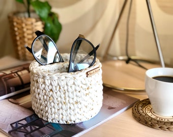 Upright Eye Glass Holder for Two Pairs, Divided Standing Glasses Case for iPhone or Cell Phone, Vertical Eyeglasses, small Crocheted Basket