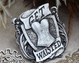 Get Waisted Badge - Pewter Corset Pin - Handcrafted Accessories by Doctor Gus - LARP SCA - Kilt Pin - Rennie Gifts