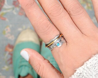 Feather Spinner Ring, Sterling Silver Ring for Women, Turquoise Ring Band, Leaf Anxiety Fidget Ring, Boho Jewelry