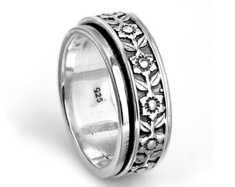 Flower Ring, Nature Ring, Spinner Ring, Sterling Silver Ring for Women, Meditation Spinning Wide Band, Anxiety Worry Fidget Ring
