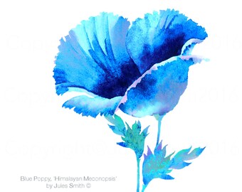 BLUE POPPY Watercolor Flower Painting, Handmade Original Flower Print, Single Bright Blue and Torquoise Poppy, Interior Wall Art Room Decor