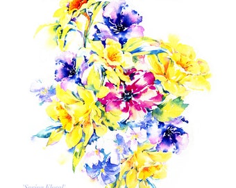 SPRING FLORAL Watercolour Print, Original Painting of Yellow and Lemon Daffodils with Lilac and Cerise Anemones, Interior Decor Wall Art