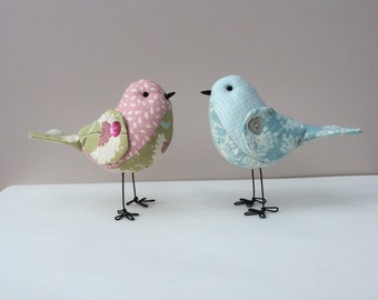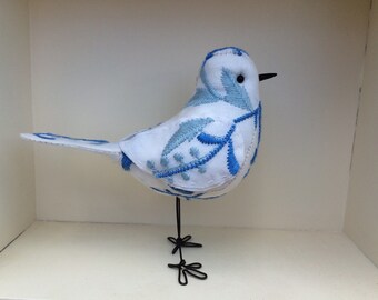 Handmade fabric bird, model, Tilda duck egg blue print fabric soft sculpture