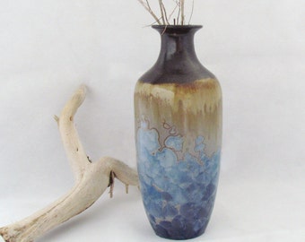 Crystal glazed vase in shades of blue and mauve with a brown neck