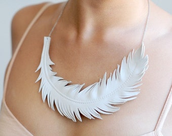 Leather Feather Necklace, Ivory White Feather Jewelry , Swan Statement Necklace