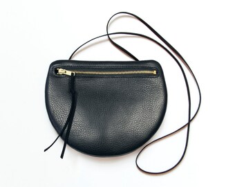 LAST ONE. PEARL Black Leather Shoulder Purse. Small Round Cross Body Purse.