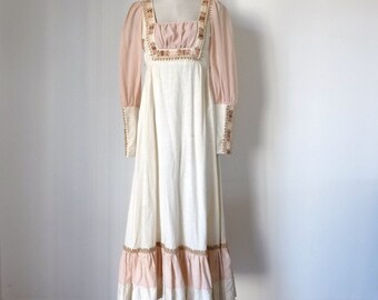 S A L E -- Vintage 70's Cream GUNNE SAX Puff Sleeve RENAISSANCE Maxi Dress S