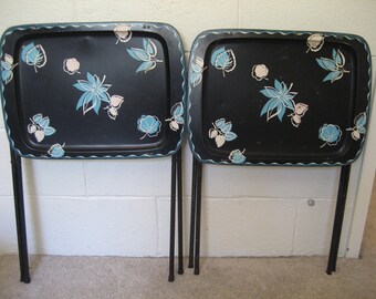 Vintage Mid-Century TV Trays Pair Aqua And Pink Leaves