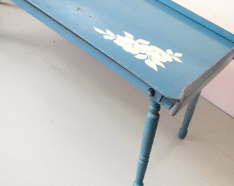 Vintage Art Table- Robins Egg Blue Art Table with White Flowers Chippy Shabby Chic Cottage TV Tray