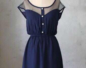 PETIT DEJEUNER NAVY - Deep midnight blue chiffon dress with black lace neckline // retro // party // day // nautical // bridesmaid // pin up
