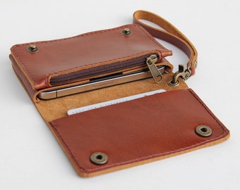 Leather iPhone wallet case with mini zipper in caramel brown (For iPhone4/4s)