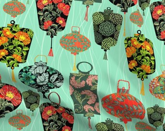 Floral Lanterns Fabric -Lanterns On Point Light Green By Honoluludesign- Lanterns Japanese Floral Cotton Fabric By The Yard With Spoonflower