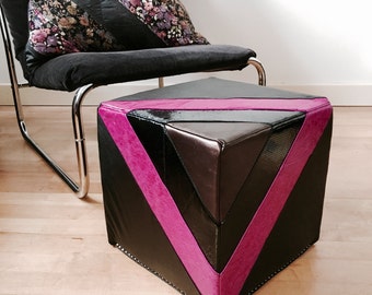 Leather Footstool | Quilted Leather Pouf in in black and fuchsia | Leather Ottoman | Pouffe | Handmade Footstool | Housewarming Gift