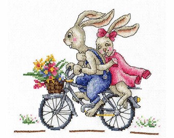 New Modern Cross Stitch Hand Embroidery Kit Cute Bunnies on Bicycle Romantic Cross Stitch Kit Gift Idea Russian Manufacture Andriana