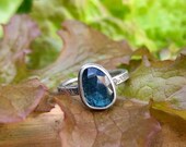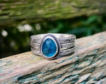 Electric Blue Apatite Rose Cut Stacking Rings with Lichen Texture Band, Apatite Ring, Lichen Ring, Rose Cut Teal Stone Ring, Size 5.75-6