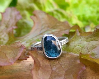 Made to Order Electric Blue Apatite Rose Cut Ring with Lichen Texture Band, Apatite Ring, Lichen Ring, Rose Cut Teal Stone Ring