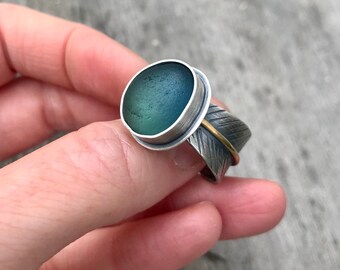 Blue and Green Seaham Sea Glass Feather Band Ring, Made to Size Ring, Feather Band Ring, Blue and Green Multi Sea Glass