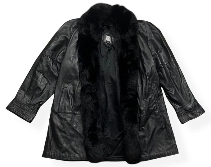 VTG 80s Grunge Black Leather Jacket with Fox Fur Trim Vintage 1980s Greg Bell Medium M