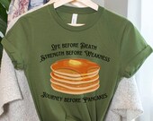 5 de 5 estrellasLe compré a mi hermana la camiseta "El viaje antes de los panqueques"; es su cita favorita de los libros de Brandon Sanderson. ¡Se la puso enseguida y parece de buena calidad! ¡La recomiendo!