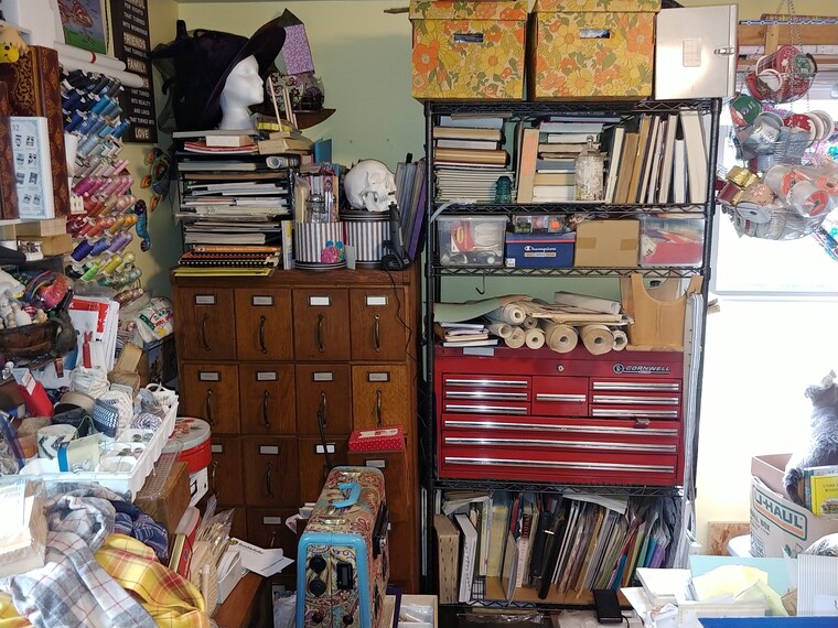 Paper, ribbon, trim, lots of rulers, felt, glass, fabric, thread, buttons, lace, elastic, bag strapping, acrylic & more. -