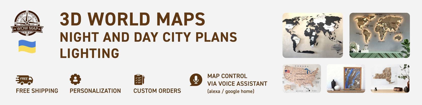 We offer customization and personalization options for you. It means that you can order a world map or map of any country or region in any color, material, size and language.