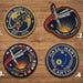 Embroidered patch – Cute blue alien peeking over an edge – stick-on, then iron-on.