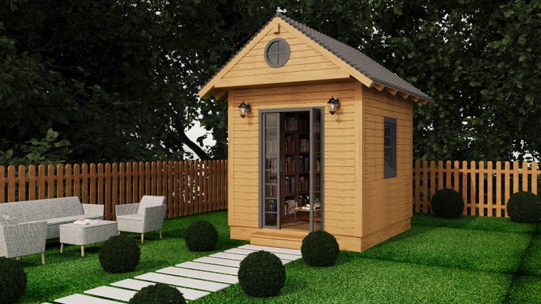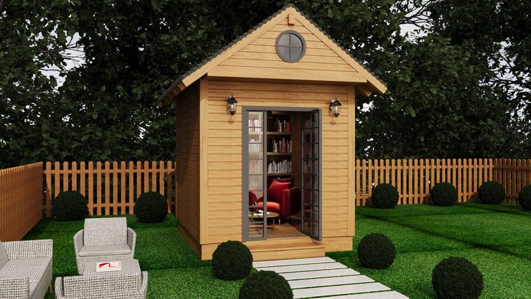 Exterior front view of The Silent Cabin – a serene wooden reading retreat in your garden. -