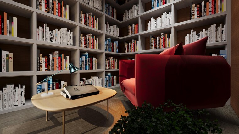 Welcome inside – cozy armchairs and bookshelves invite you to unwind and read. -