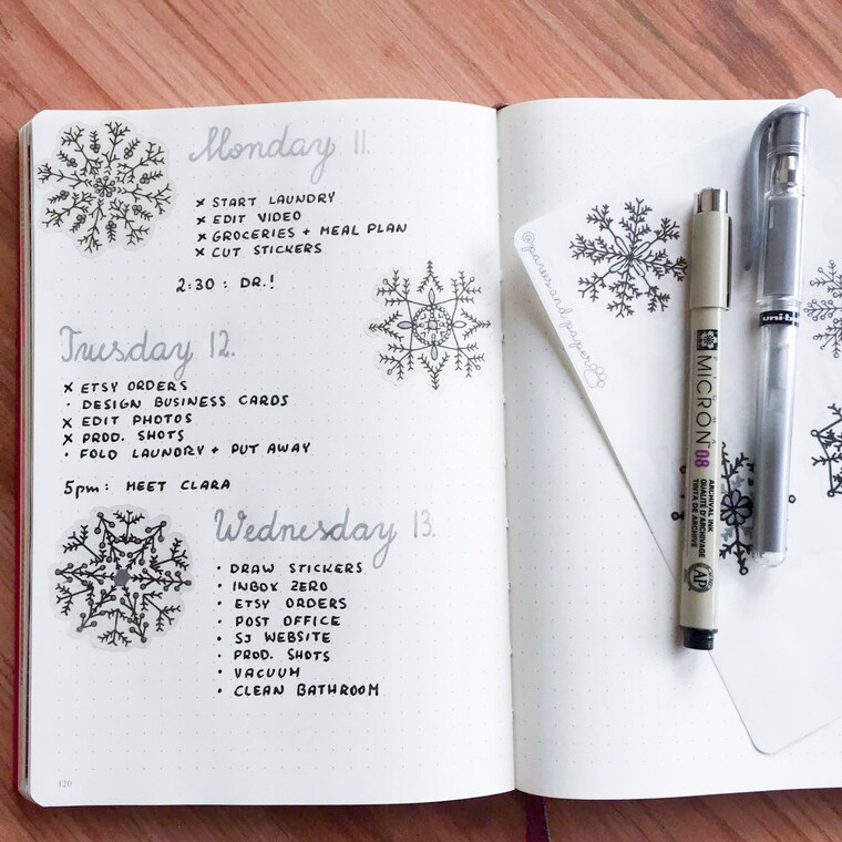 My snowflake stickers in my own BuJo. I had so much fun drawing these and I LOVED using them during the winter months!