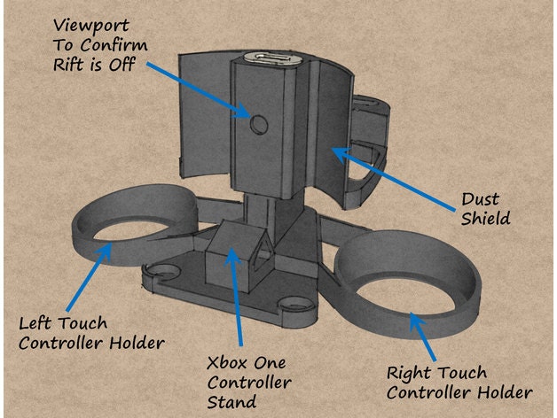 This stand includes storage for the Touch Controllers and Oculus controller as well as other things such as the microfiber cloth. Along with this, the base includes a location to put the Xbox One controller and convenient canals in the base which allow you to adjust the weight of the stand using rolls of pennies.